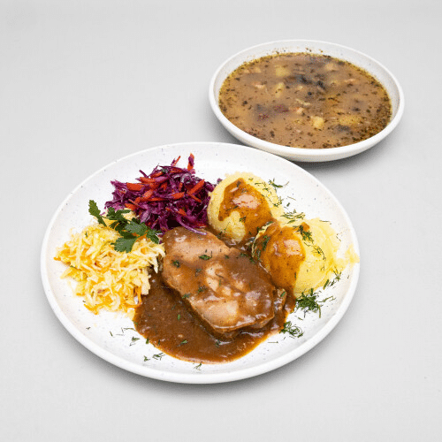 Zupa kapuśniak i gulasz z ziemniakami, surówkami